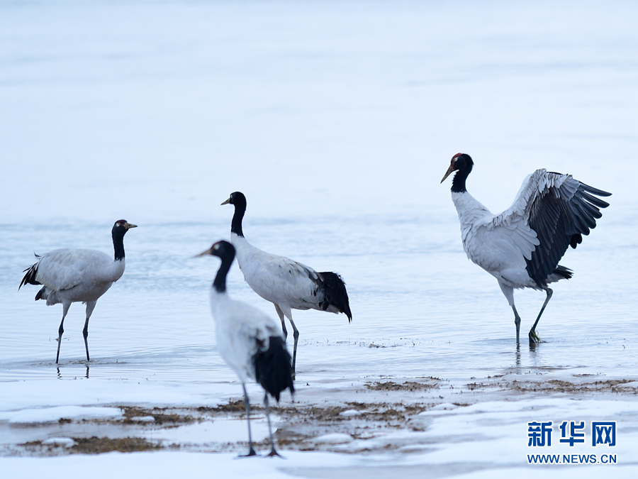 在位于青海省果洛藏族自治州瑪多縣的三江源國(guó)家公園黃河源園區(qū)內(nèi),數(shù)只黑頸鶴在此棲息覓食。新華社記者 張龍 攝