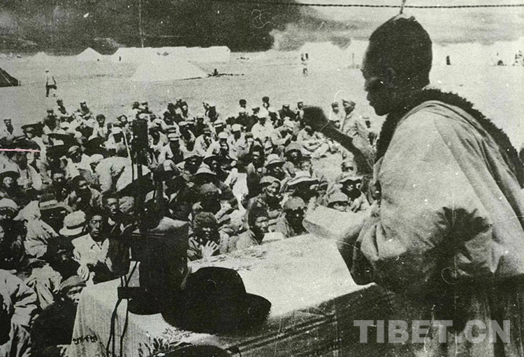 圖為1952年8月果洛工作團在達日縣查郎寺召開果洛頭人、代表聯(lián)誼會議,扎喜旺徐團長在聯(lián)誼會議上作有關(guān)民族團結(jié)的報告 圖片由央金提供