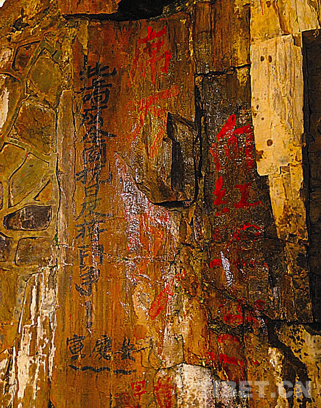 圖為一九三五年七月,中國工農(nóng)紅軍二方面軍第六軍團在長征途中,曾路過班瑪、久治一帶,并在班瑪絨玉地區(qū)的森林石壁上刻下的“北上響應(yīng)全國抗日反蔣斗爭”的標(biāo)語