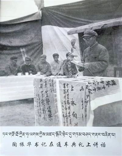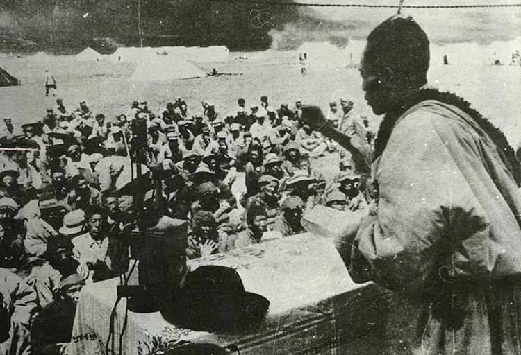 圖為1952年8月工作團在達日縣查郎寺召開果洛頭人、代表聯(lián)誼會議,扎喜旺徐團長在聯(lián)誼會議上作有關民族團結的報告。圖片由央金提供