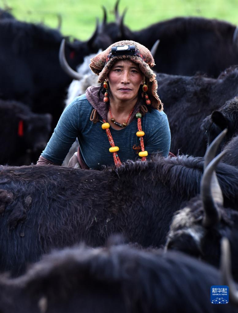 7月13日,羅日卓瑪在牦牛群中勞作。新華社記者 陳燮 攝