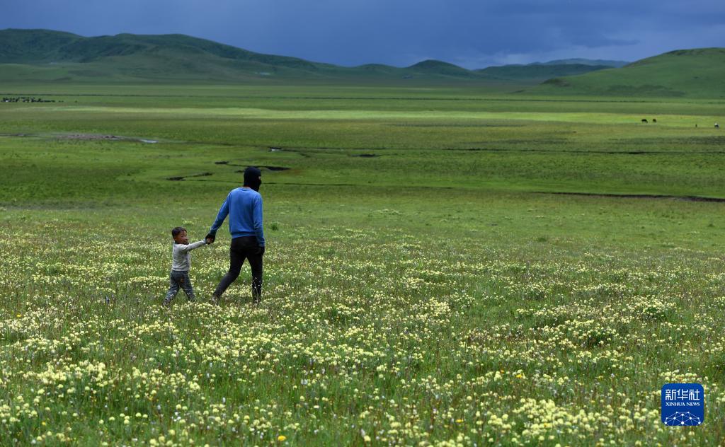 7月13日,巴周的女婿扎西拉著兒子走在家里的草場(chǎng)上。新華社記者 陳燮 攝