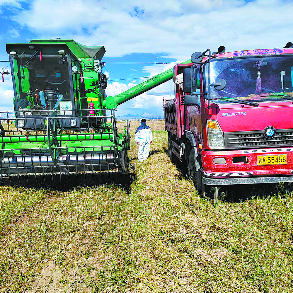 門源縣浩門鎮(zhèn)小沙溝村村民們正使用合作社的收割機(jī)收割莊稼。