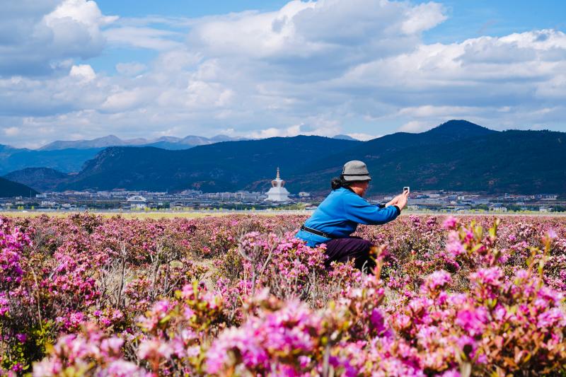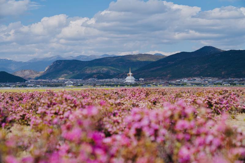 五月的香格里拉,是杜鵑花盛開的季節(jié)。建塘鎮(zhèn)稱尼壩子上的粉色杜鵑開放,大片的杜鵑鋪滿了山腳下的壩子,仿佛給大地鋪上了粉色地毯。