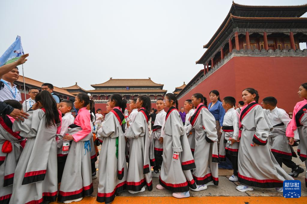 5月31日,來自青海省玉樹州的孩子們在北京故宮博物院外排隊(duì)等候進(jìn)入?yún)⒂^。新華社記者 陳曄華 攝