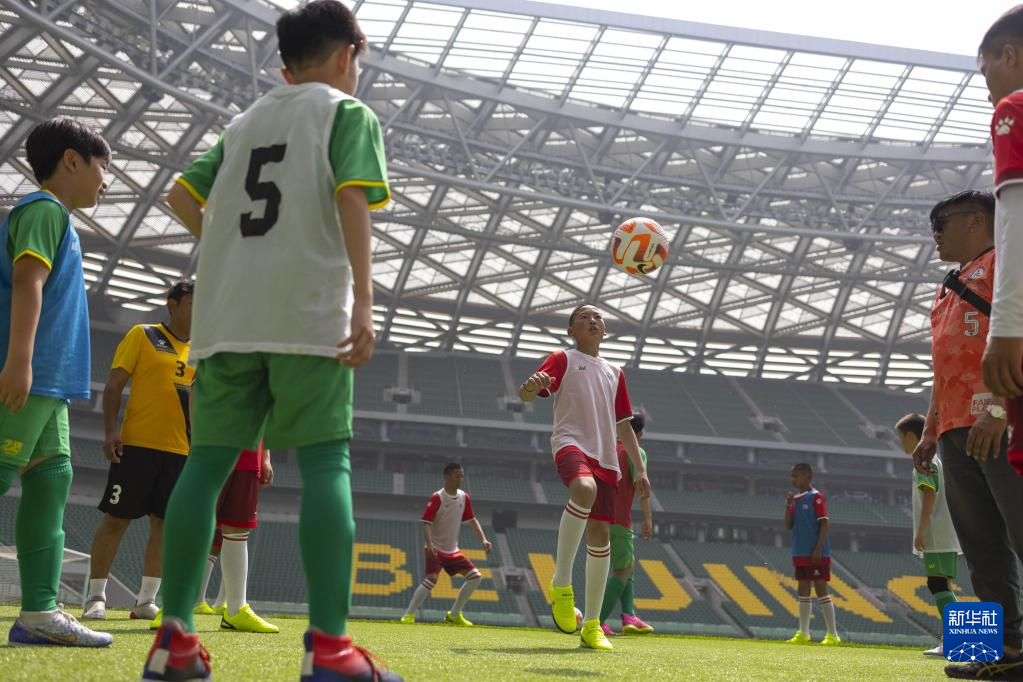 6月1日,在北京工人體育場,藏族孩子與國安少年足球隊(duì)隊(duì)員訓(xùn)練交流。新華社記者 才揚(yáng) 攝