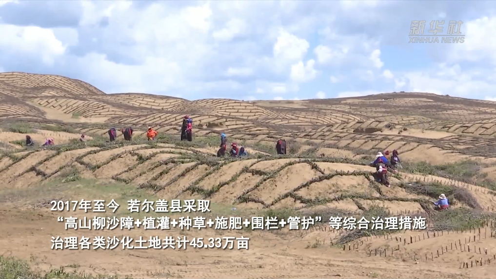 位于黃河上游的四川省阿壩州若爾蓋縣地處川西高原向青藏高原過渡地帶,曾因多種原因一度飽受“沙化”之苦。2017年至今,若爾蓋縣采取“高山柳沙障+植灌+種草+施肥+圍欄+管護(hù)”等綜合治理措施,治理各類沙化土地共計45.33萬畝,“編織”出一幅黃河邊沙化治理新畫卷。