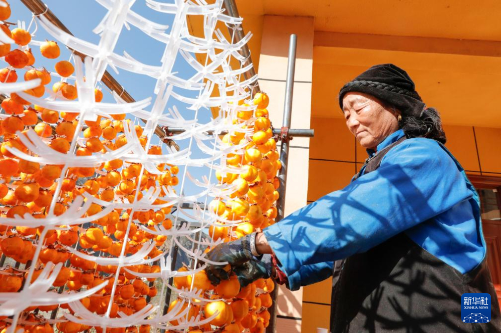 11月14日,在甘肅省甘南藏族自治州舟曲縣立節(jié)鎮(zhèn)杰迪村,村民在晾曬柿子。新華社記者 方欣 攝