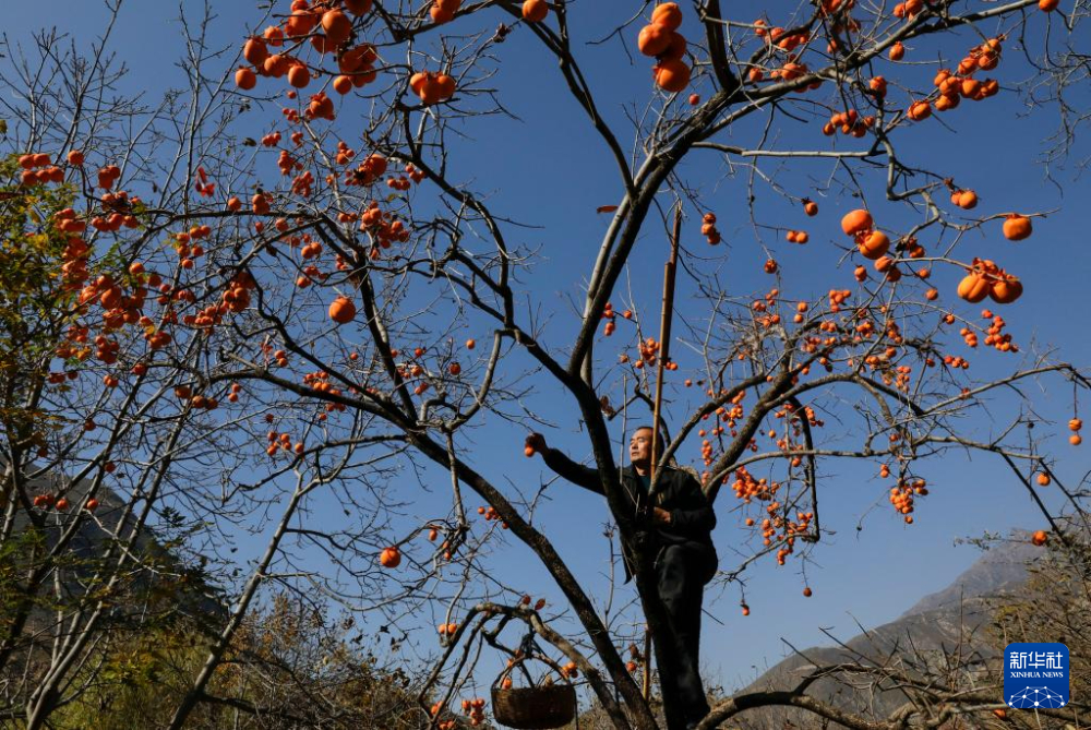 11月14日,在甘肅省甘南藏族自治州舟曲縣立節(jié)鎮(zhèn)杰迪村,村民在采摘柿子。新華社記者 方欣 攝
