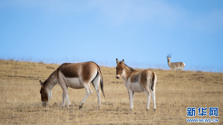 在三江源國家公園黃河源園區(qū)內(nèi)活動的藏野驢和藏原羚。新華網(wǎng) 潘彬彬 攝