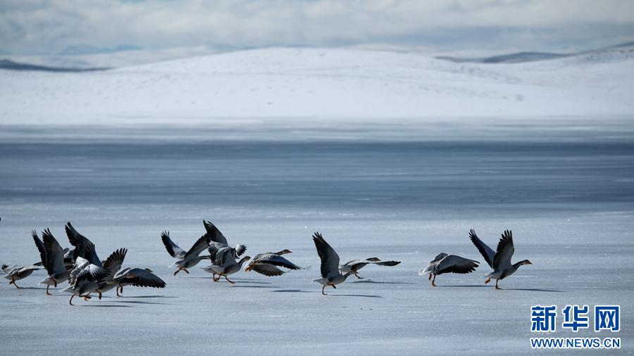 在三江源國家公園黃河源園區(qū)內(nèi)一處濕地上活動的斑頭雁。新華網(wǎng) 潘彬彬 攝
