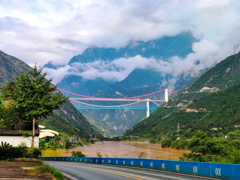 麗香鐵路、香麗高速、國道214虎跳峽段“三路“同框 (李競若 攝)