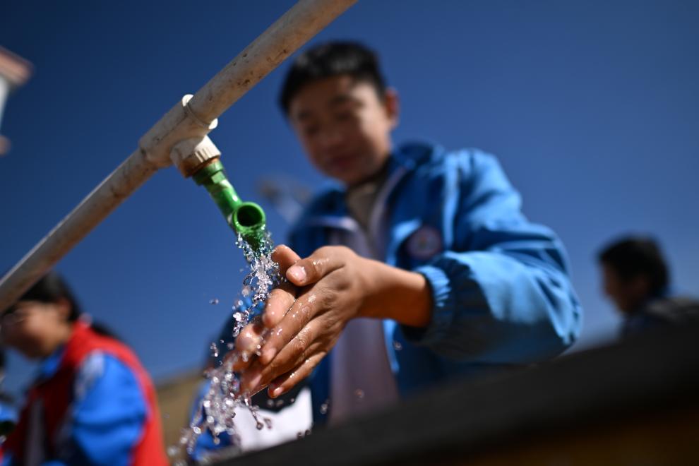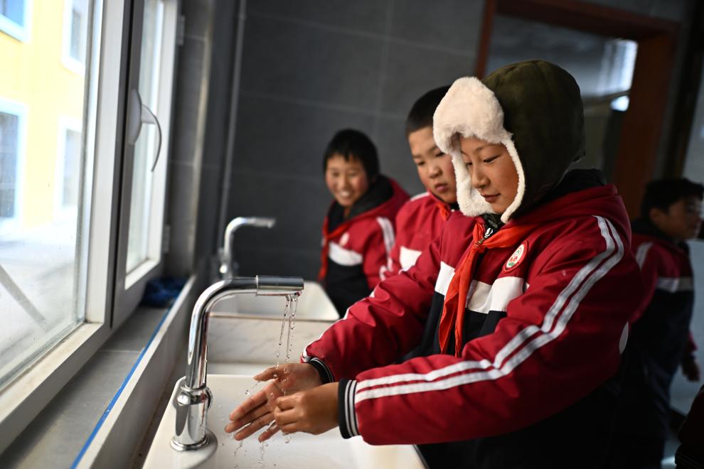 在青海省果洛藏族自治州瑪多縣花石峽鎮(zhèn)藏文中心寄宿制學(xué)校,五年級(jí)學(xué)生東桑(右一)在使用廁所后洗手,該學(xué)校是環(huán)境衛(wèi)生特別項(xiàng)目學(xué)校之一(11月2日攝)。新華社記者 張宏祥 攝