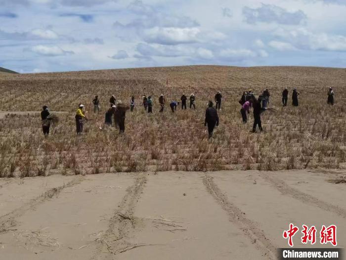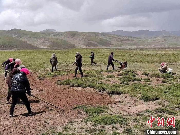 圖為牧民與企業(yè)工作人員參與阿尼瑪卿水源涵養(yǎng)與草原生態(tài)保護(hù)修復(fù)項(xiàng)目。果洛州瑪沁縣自然資源和林業(yè)草原局 供圖