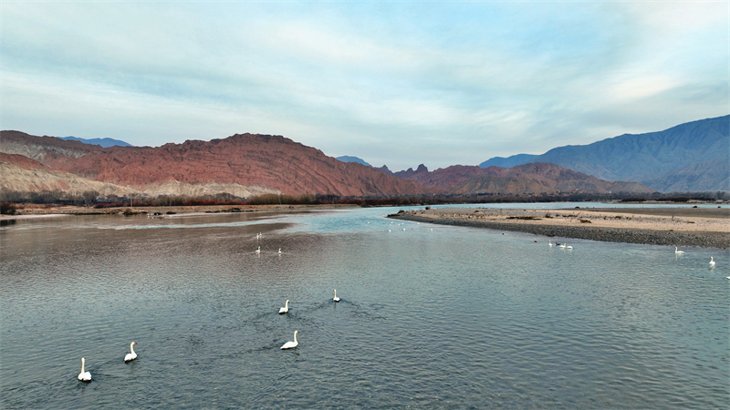 寒冬時(shí)節(jié),位于青海省海南藏族自治州貴德縣境內(nèi)的千姿湖景色迤邐,大天鵝在湖水中或起舞或休憩,丹霞山在岸畔巍峨連綿。