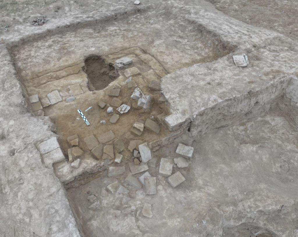 此外,考古隊(duì)員在最大的房址發(fā)現(xiàn)方形磚砌祭臺(tái)。專(zhuān)家表示,磚砌祭臺(tái)屬熱水墓群中的首次發(fā)現(xiàn),祭臺(tái)中發(fā)現(xiàn)大量磚塊。通過(guò)陵園及祭祀建筑的規(guī)模、數(shù)量等線(xiàn)索推測(cè),這個(gè)墓葬的規(guī)格、墓主人的身份等級(jí)要高于2018血渭一號(hào)墓。