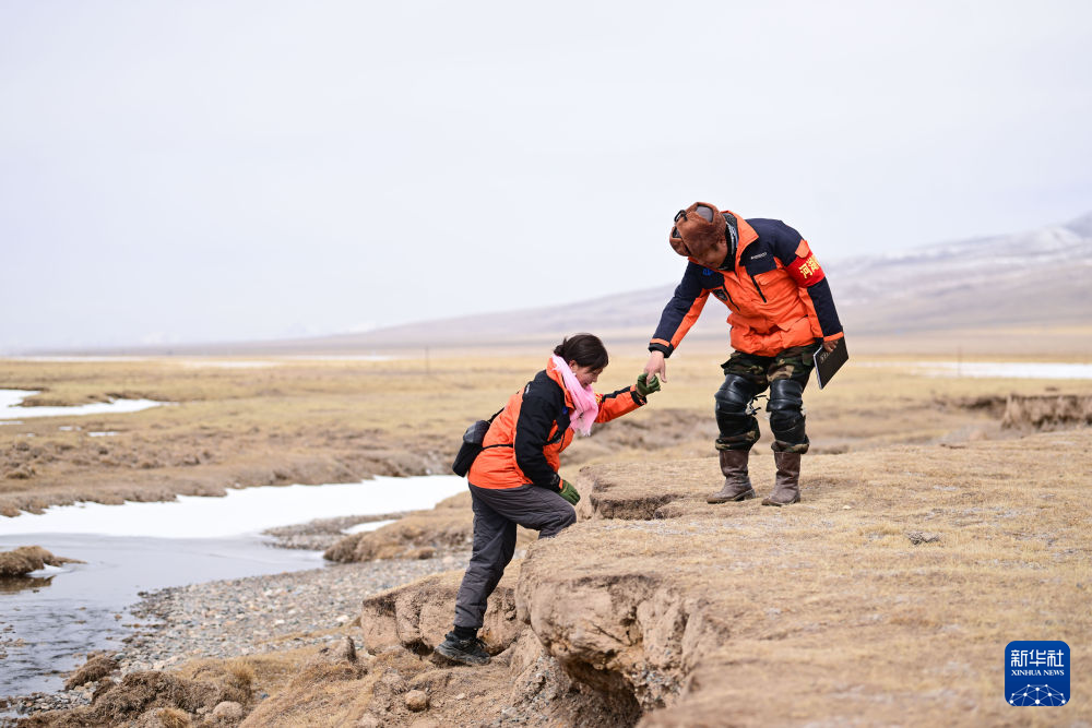 3月21日,葉金俄日(右)在渡過冰河后等待妻子?xùn)|木措。新華社記者 張龍 攝