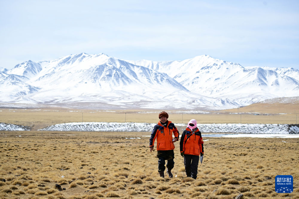 3月21日,葉金俄日(左)與妻子?xùn)|木措在青海省海北藏族自治州祁連縣的黑河流域記錄巡護(hù)日志。新華社記者 耿輝凰 攝
