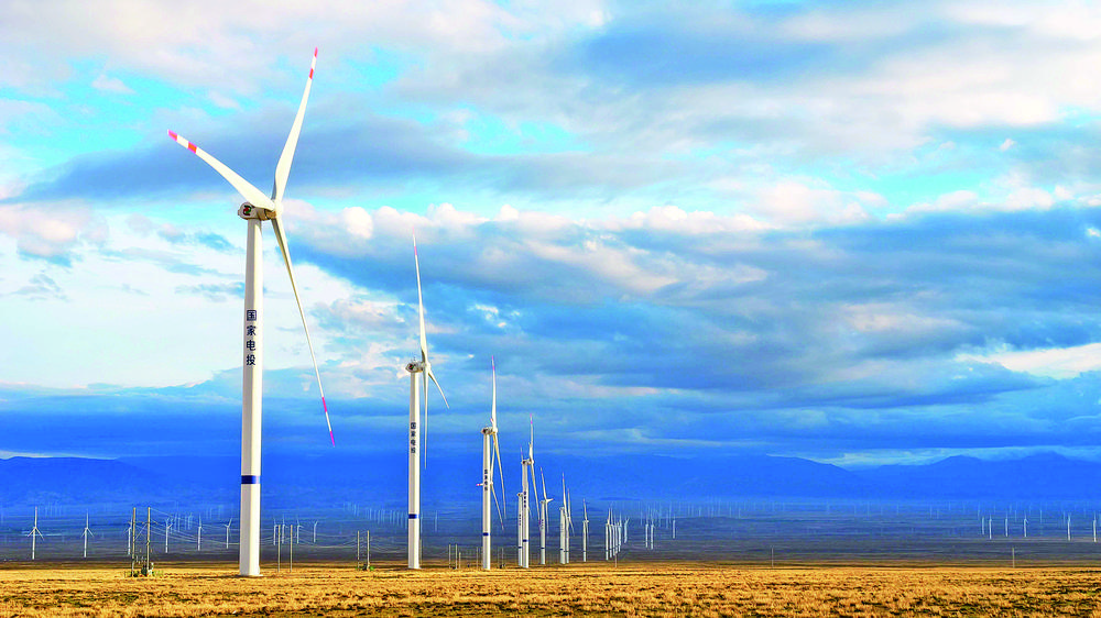 大約行駛50公里,只見一臺臺風力發(fā)電機如守望者般擎天而立,風機頂端三個碩大無比、潔白的葉片迎風轉動,在天空中劃出優(yōu)美弧線。自然之壯美,人力之奇?zhèn)?,在這里交織出一曲動人交響。