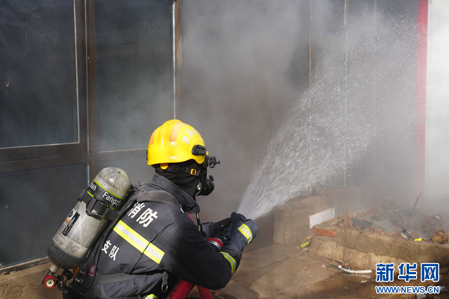 在演練現(xiàn)場,消防員正在撲救模擬的房屋火災(zāi)。(海南州消防救援支隊供圖)