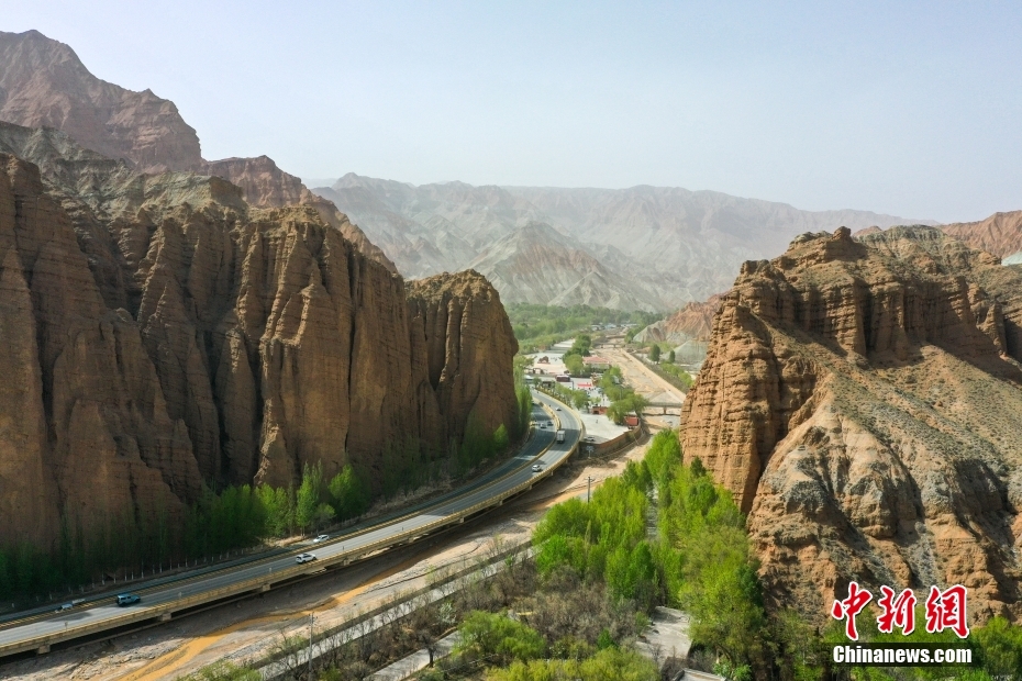 4月15日,位于青海省海南藏族自治州貴德縣境內(nèi)的青海貴德國(guó)家地質(zhì)公園春意盎然。該地質(zhì)公園以自然地貌景觀和地質(zhì)遺跡為主,丹霞地貌悠久奇特。(無(wú)人機(jī)照片)中新社記者 馬銘言 攝