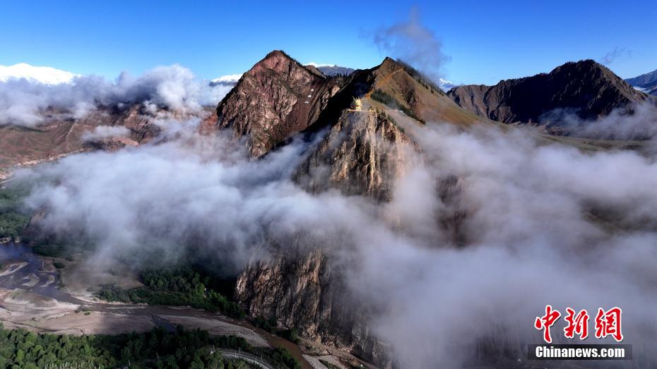 6月,攝影愛(ài)好者拍攝到的祁連山腹地青海省海北藏族自治州祁連縣云霧繚繞,云海與雪山、峽谷、森林交相輝映,蔚為壯觀。畫(huà)面中,云層飄浮在群山之間,時(shí)而薄如輕紗,時(shí)而團(tuán)若棉絮,形成了美麗的低空云海,山間小城在薄云繚繞下,若隱若現(xiàn),宛若仙境。圖為祁連山間云霧圍繞。(無(wú)人機(jī)照片)楊春麗 攝