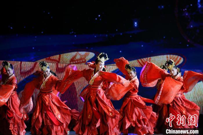 圖為晚會(huì)現(xiàn)場(chǎng)進(jìn)行舞蹈表演《絲路錦繡》。中新社記者 馬銘言 攝