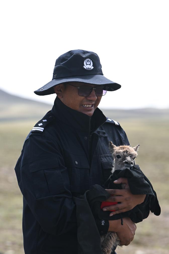 7月8日,青海省公安廳森林警察總隊(duì)曲麻萊森林公安局局長秋松多杰在照顧一只小藏羚羊。新華社記者 張龍 攝