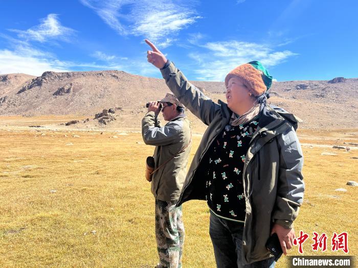 圖為尚英(右)和吉太本(左)在管護(hù)區(qū)內(nèi)觀察野生動物。李江寧 攝