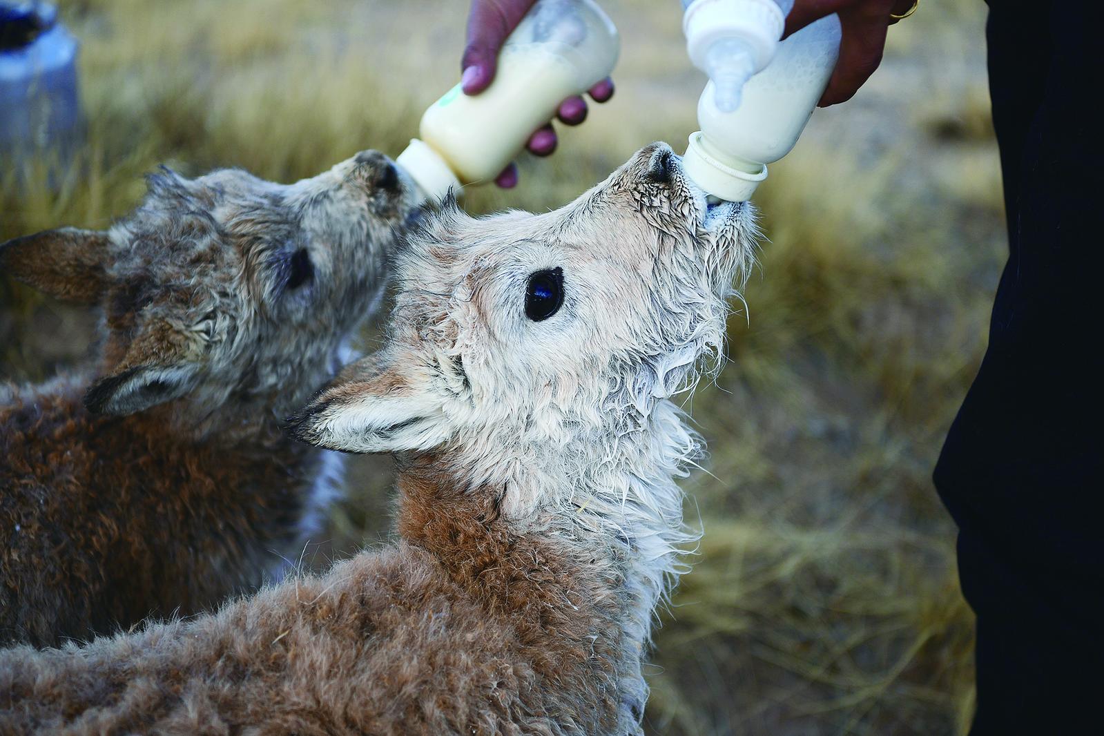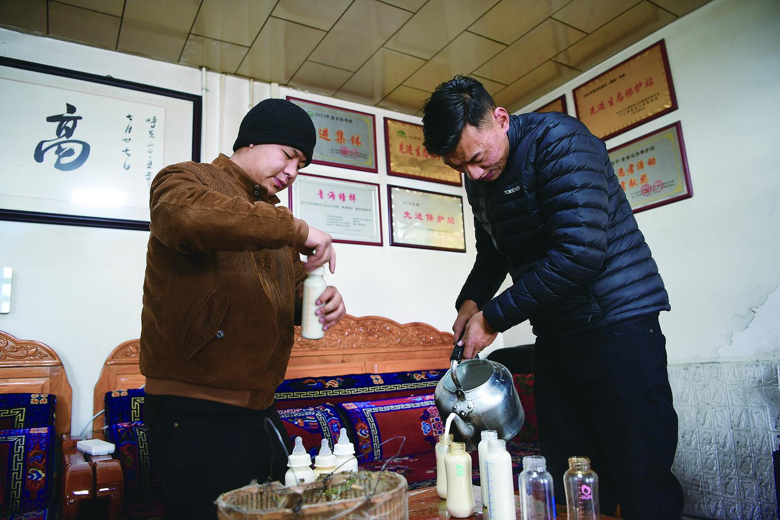 11月19日中午剛過(guò),三江源國(guó)家公園索南達(dá)杰保護(hù)站內(nèi),才仁洛松和江措開(kāi)始為小藏羚羊準(zhǔn)備牛奶。牛奶燒開(kāi),涼到適合溫度,奶瓶用沸水浸泡沖洗,再將涼好的牛奶依次灌入奶瓶中,緊接著,才仁洛松和江措來(lái)到養(yǎng)護(hù)小藏羚羊的圍欄內(nèi),小藏羚羊遠(yuǎn)遠(yuǎn)看見(jiàn)兩人,咩、咩、咩地向兩人跑去,圍著兩人用頭親昵地頂著,好像在撒嬌。