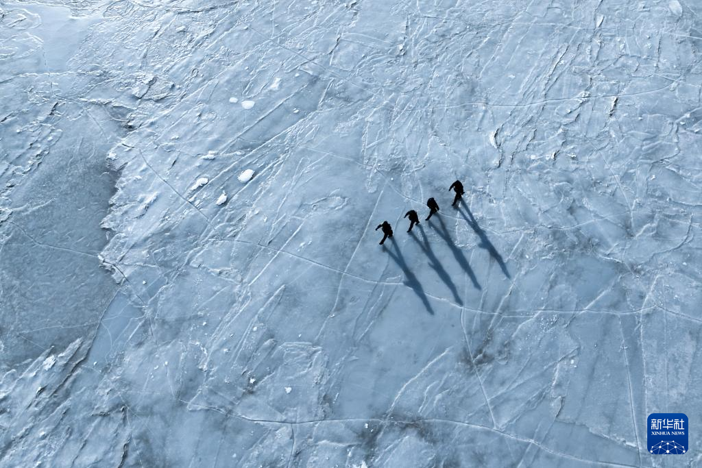 1月9日,剛察縣青海湖派出所民警在巡護青海湖(無人機照片)。新華社記者 張龍 攝