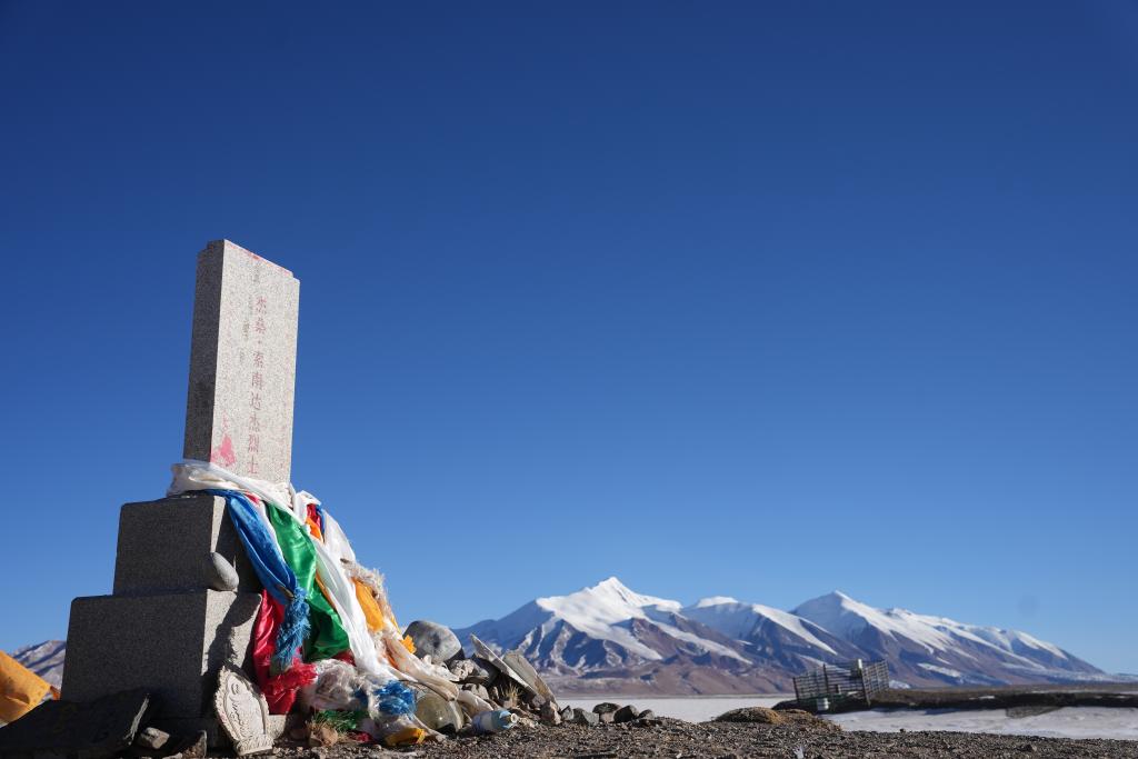 這是可可西里無人區(qū)腹地太陽湖湖邊索南達(dá)杰烈士紀(jì)念碑,索南達(dá)杰犧牲在太陽湖,他的骨灰也撒在太陽湖(攝于2025年1月14日)。新華社發(fā)