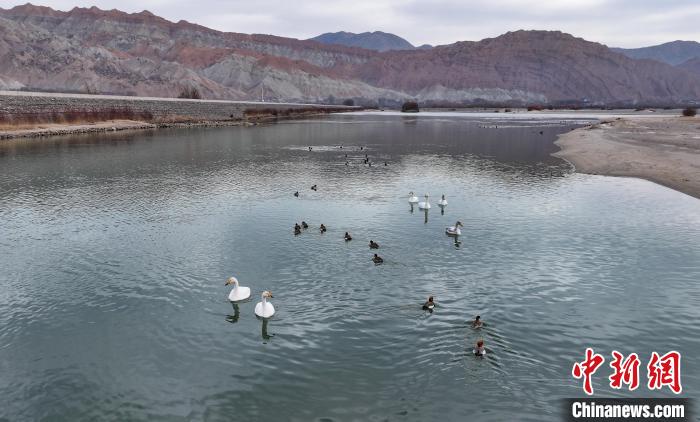 2月27日,在青海省海南藏族自治州貴德縣境內(nèi),越冬候鳥與丹霞地貌相映成趣。(無人機照片) 中新社記者 馬銘言 攝
