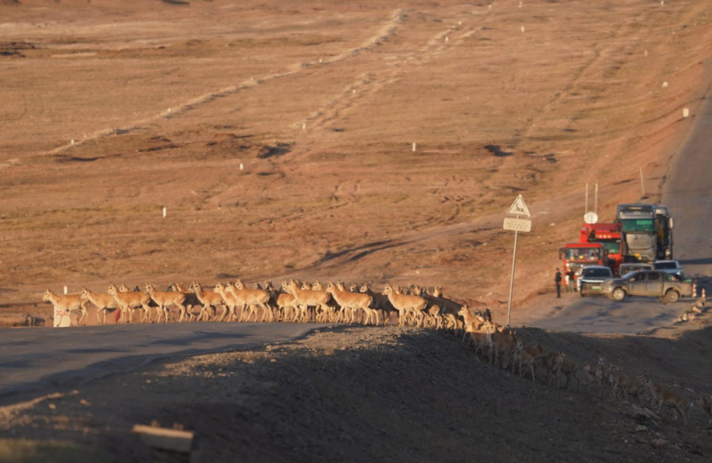 繁忙的公路突然“靜音”,遠處車流、人群安靜等待,幾只藏羚羊緩慢踏上公路,頭羊反復(fù)“試探”確認安全后,羊群再迅速穿過公路。