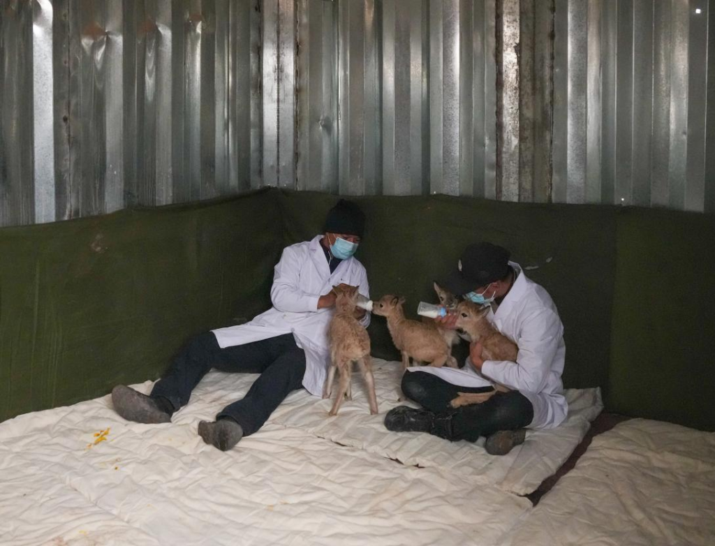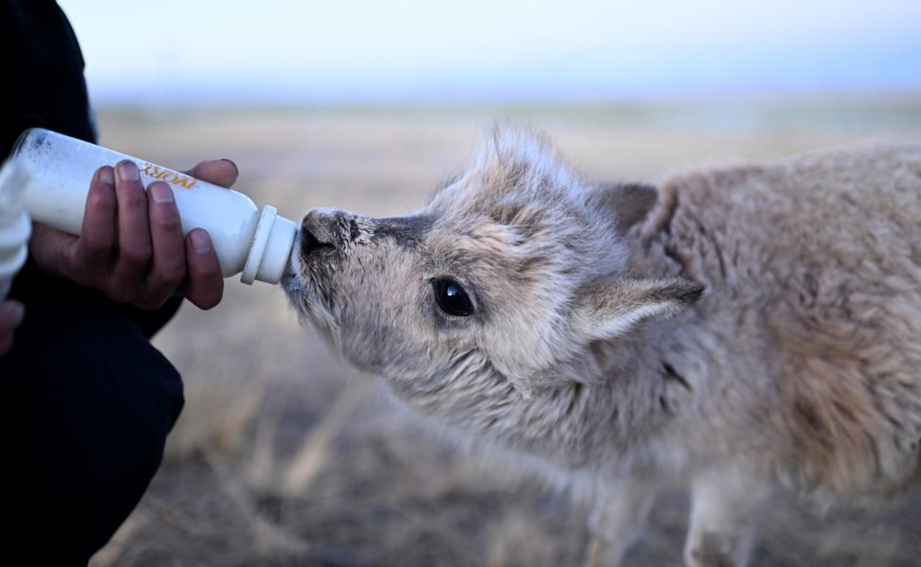 巡山隊員在可可西里卓乃湖保護站給救助的小藏羚羊喂奶。新華社記者 杜笑微 攝