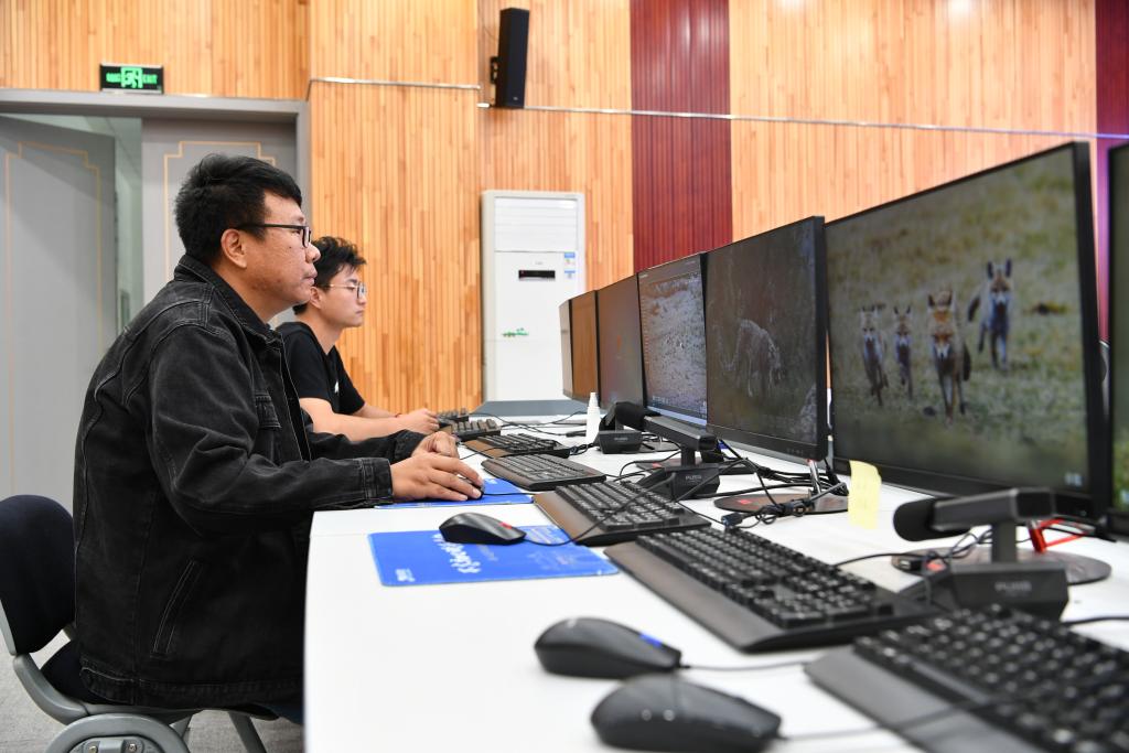 青海省生態(tài)環(huán)境廳信息中心工作人員正在分析野生動物監(jiān)測畫面。新華社發(fā)(劉紅 攝)