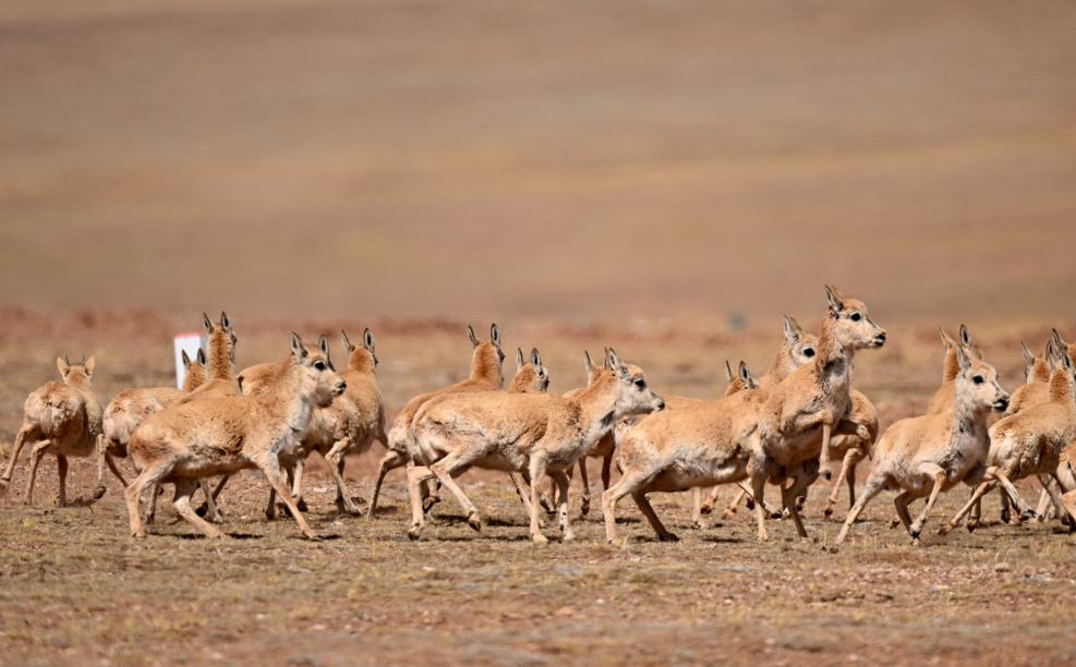 一群藏羚羊通過(guò)青藏公路后向卓乃湖行進(jìn)。新華社記者 張宏祥 攝