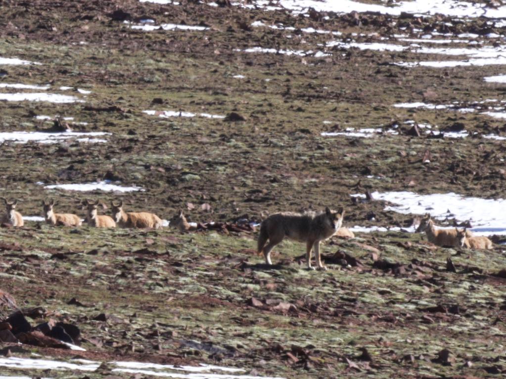 在青??煽晌骼锏貐^(qū)拍攝的狼和藏羚羊群。新華社記者 杜笑微 攝