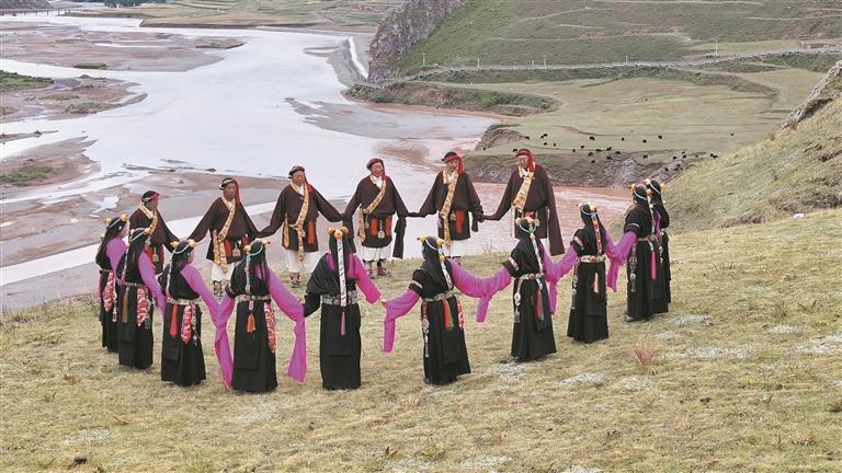 囊謙縣老年文藝舞蹈隊在扎曲網(wǎng)狀水系旁演繹古老歌舞。殷之皓 攝