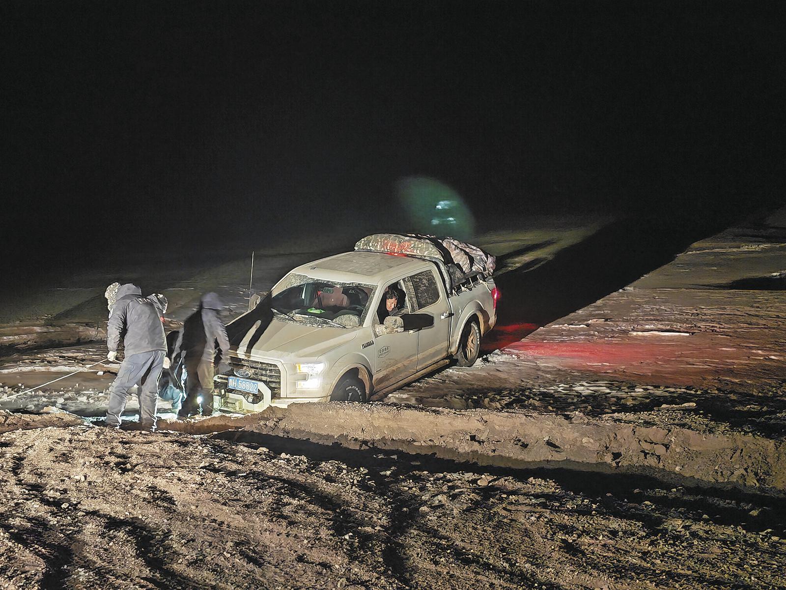 “此行主要為打擊N35非法穿越,我們沿著非法穿越者常走的路線,路上也遇到了很多困難。”隨隊(duì)記者口述,為了盡早趕到庫(kù)南保護(hù)站,8日20時(shí)一行人從太陽(yáng)湖出發(fā),車輛卻不斷陷入冰河,還遭遇了爆胎。9日早晨6時(shí),大家才在車?yán)镄菹⒘藘蓚€(gè)小時(shí),之后接著趕路。在斷斷續(xù)續(xù)的信號(hào)中,隨隊(duì)記者陸續(xù)發(fā)回現(xiàn)場(chǎng)照片和視頻。