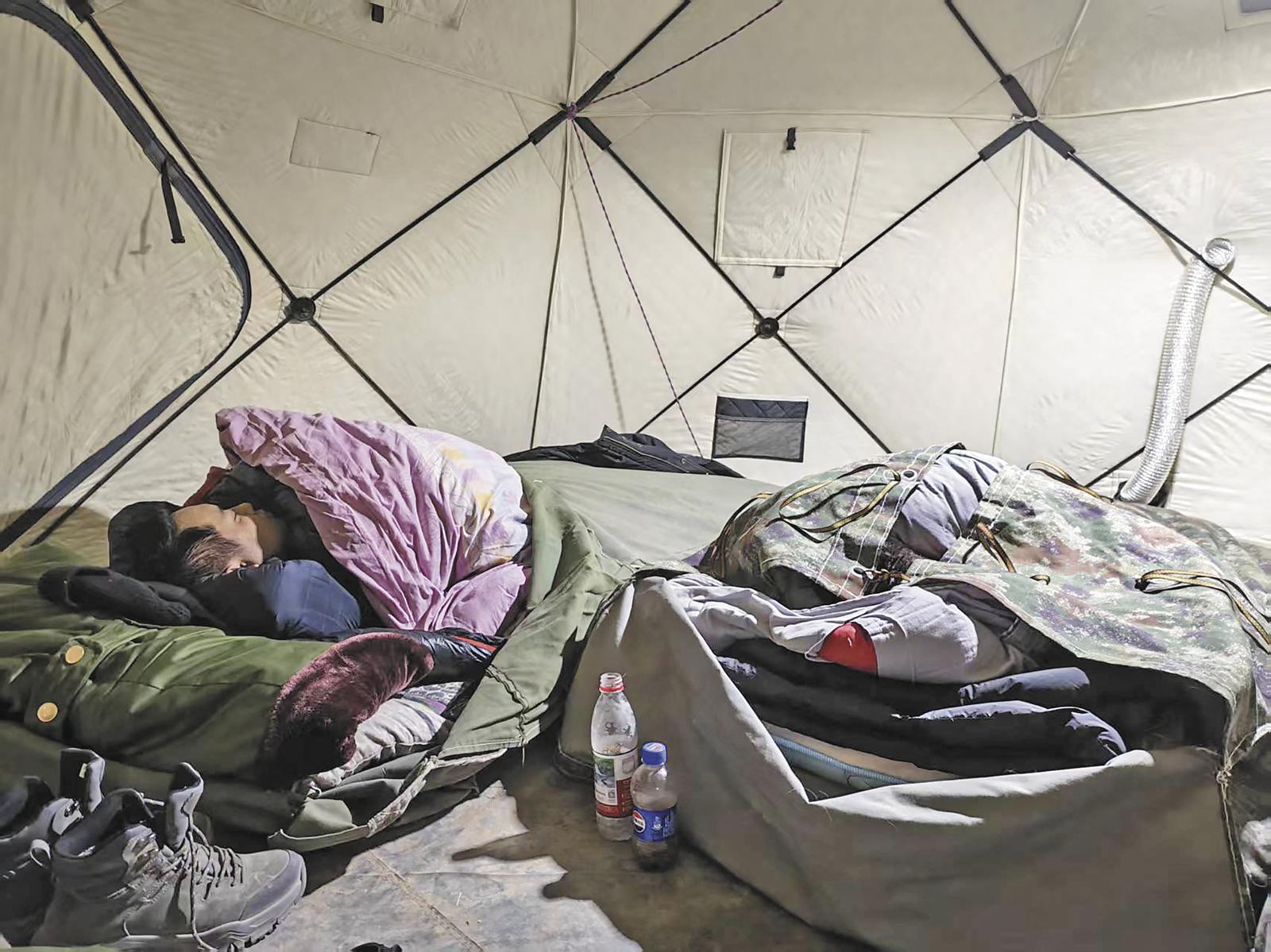 晚上記者和巡護(hù)隊(duì)員們一起睡在帳篷里。
