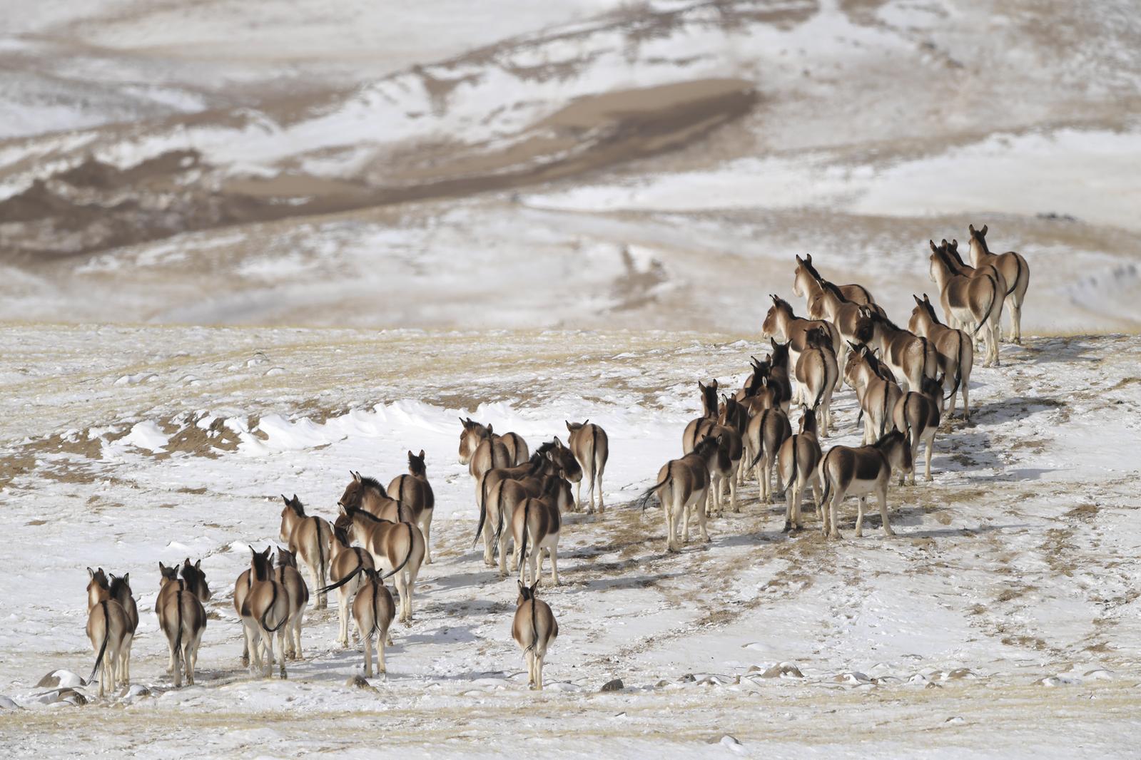 窗外景色仿佛凝固——除了遠(yuǎn)處連綿的雪山,就是大片大片的黃:枯黃的草、淺黃的沙,偶爾陰山處覆著一層薄雪,算是這荒原上唯一的點(diǎn)綴。直到視野里出現(xiàn)一個(gè)個(gè)移動(dòng)的黑點(diǎn),我們頓時(shí)來了精神。