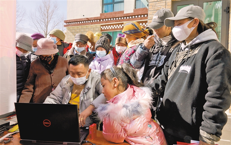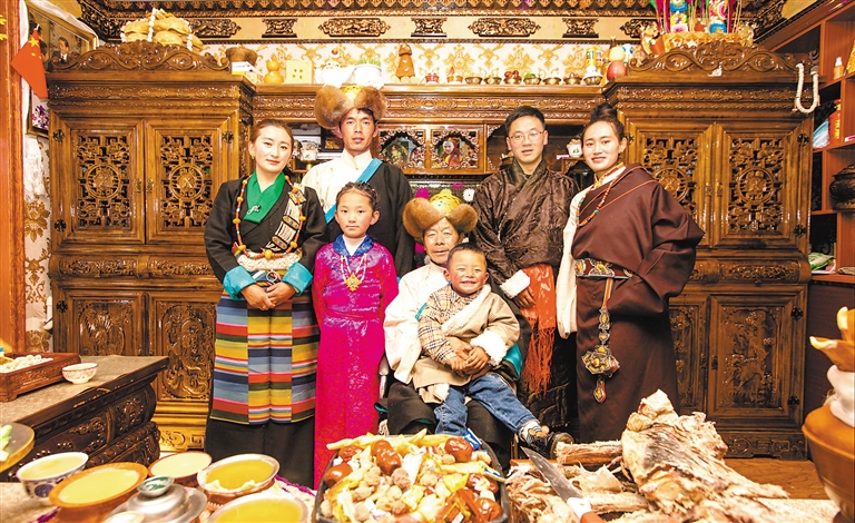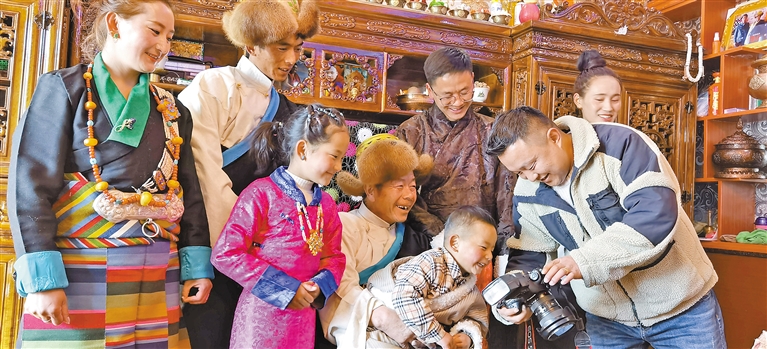 “來,大家看這里!”“咔嚓”一聲,相機(jī)定格了鏡頭前旦巴一家四口的笑容。在藏歷新年來臨之際,墨竹工卡縣甲瑪鄉(xiāng)赤康村村民身穿節(jié)日盛裝,等待著專業(yè)攝影師免費(fèi)拍攝、現(xiàn)場打印全家福照片,留住與家人歡聚一堂的溫馨時(shí)刻。