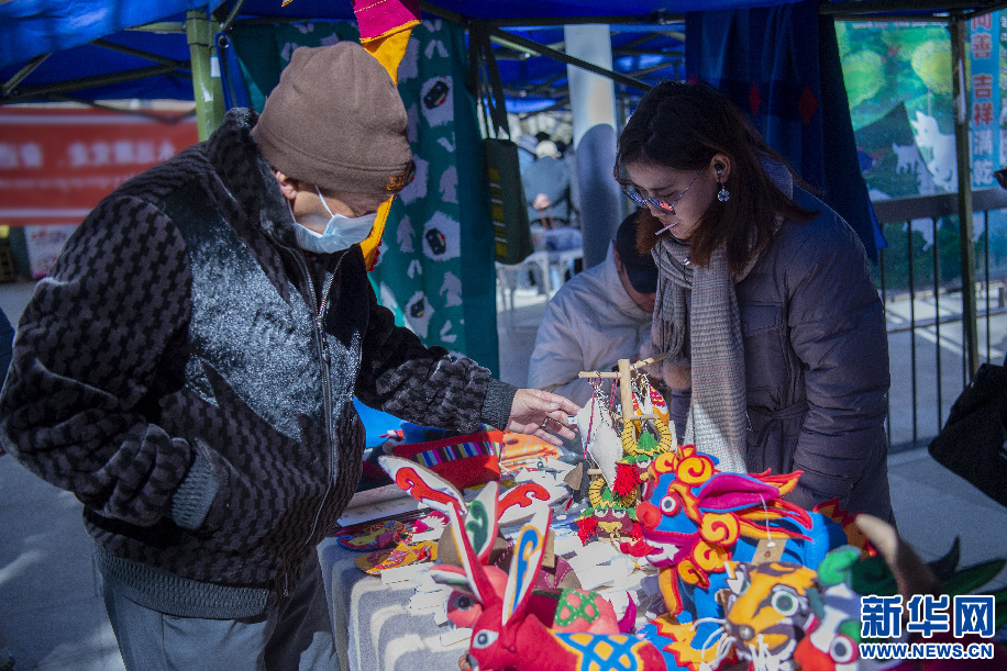 2月14日,群眾在直孔朗霞傳統(tǒng)針織加工專(zhuān)業(yè)合作社展位上挑選由傳統(tǒng)針織技藝制作的年貨。新華網(wǎng) 旦增努布 攝
