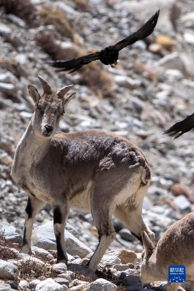 這是在珠峰國家級(jí)自然保護(hù)區(qū)內(nèi)拍攝的巖羊和黃嘴山鴉(5月13日攝)。新華社發(fā)(旦增努布 攝)