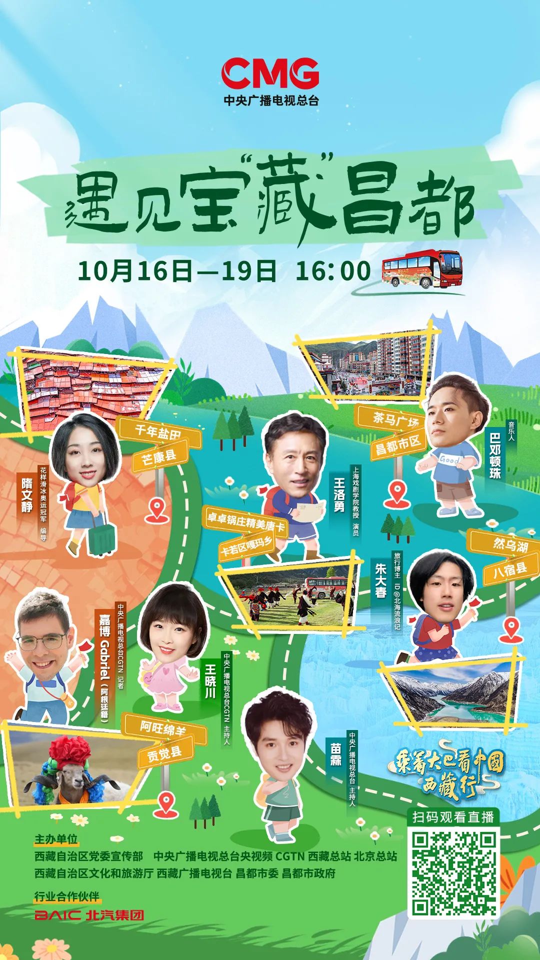 10月16日至10月19日,“跨越山海 格?;ㄩ_——乘著大巴看中國 西藏行”大型融媒體活動播出,總臺大巴車開進西藏昌都,自芒康過貢覺,經(jīng)卡若到八宿,海拔從2300米一路攀升,探訪團深入千年鹽田,探秘萬年冰川,品嘗原生態(tài)的“阿旺綿羊”,領略中國民間文化藝術之鄉(xiāng)——嘎瑪鄉(xiāng)的風采,多彩的地貌風光與璀璨的藏東文化,盡顯昌都文化魅力。本次活動由西藏自治區(qū)黨委宣傳部、中央廣播電視總臺央視頻、CGTN、西藏總站、北京總站和西藏自治區(qū)文化和旅游廳、西藏廣播電視臺、昌都市委市政府聯(lián)合主辦。