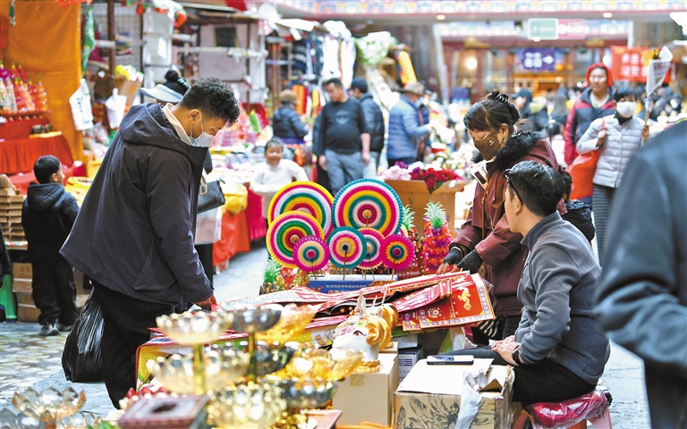 藏歷新年將至,拉薩市大街小巷熱鬧非凡。年貨一條街、超市、商店?duì)幭嗤瞥龈魇侥曦?,各種商品琳瑯滿目,置辦年貨的人摩肩接踵。古城拉薩在歡樂祥和的氛圍中喜迎藏歷新年。