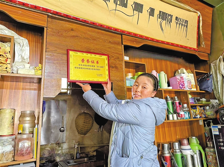 圖為次仁曲宗在門店懸掛“衛(wèi)生標(biāo)桿”獎(jiǎng)牌。記者 孫開遠(yuǎn) 索朗曲珍 攝