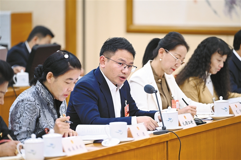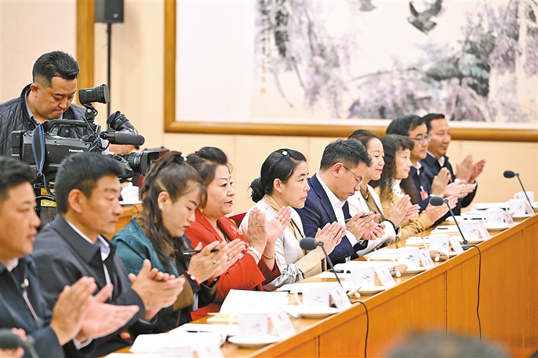 西藏全國(guó)人大代表扎西江村(中)在西藏代表團(tuán)全體會(huì)議上發(fā)言。