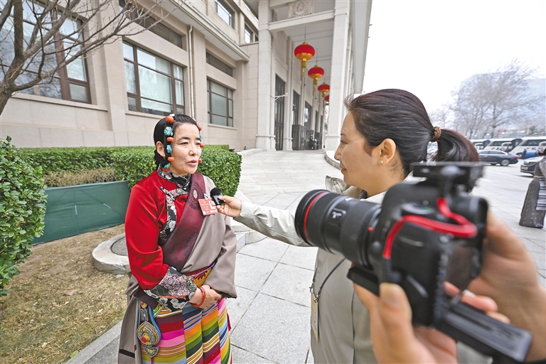 西藏全國(guó)人大代表其德(左)接受媒體采訪。
